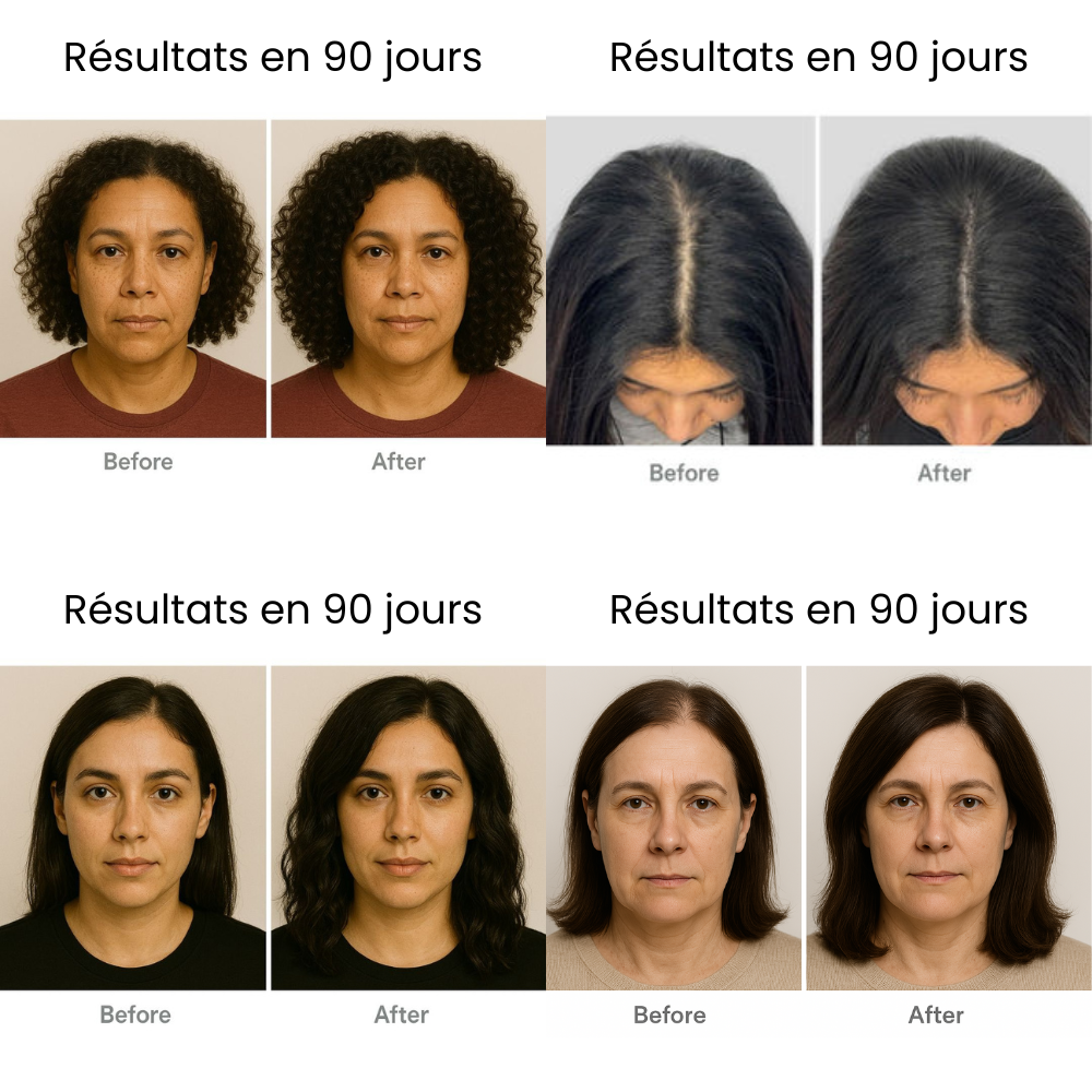 Nous offrons une garantie de remboursement de 90 jours : si vous ne constatez pas d'amélioration notable de la santé de vos cheveux ou de votre cuir chevelu dans les 90 jours, vous pouvez obtenir un remboursement complet, sans poser de questions.