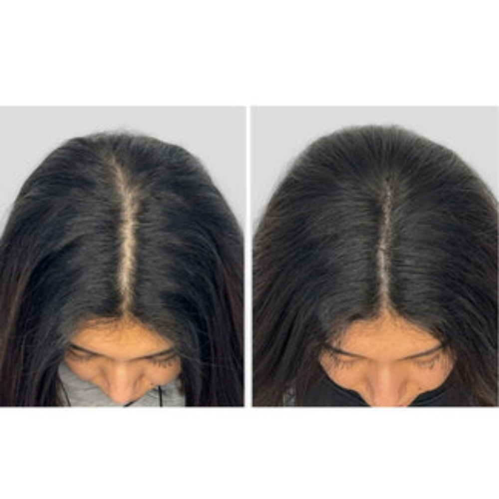 Jour 90 : Changements visibles dans la densité des cheveux, croissance plus complète le long de la racine des cheveux et des raies, et une apparence générale plus saine.